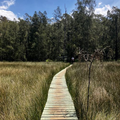 Halverwege veranderde het landschap even in een soort moeras. Via een plankenpad liep je over het riet heen, naar de rivier toe. Bijzonder hoe de verschillende landschappen zo in elkaar overliepen.