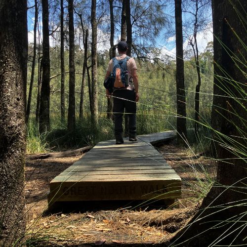 De eerste afslag die ons in de bush zou brengen, was afgesloten. Ze hebben er best wel een handje van om wandelroutes ineens te sluiten. Niet begaanbaar door bijvoorbeeld te veel regenval. Of afgebroken stenen. Of ze zijn iets aan het renoveren. Gelukkig was er een omleiding. Kilometertje erbij. Doen we.