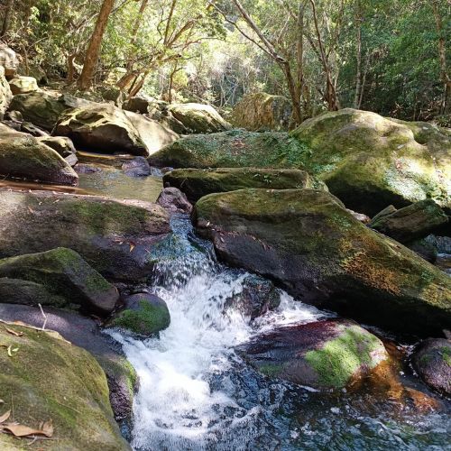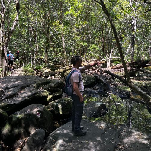 Uiteindelijk kwamen we bij een rivier terecht. We zijn een paar keer water overgestoken. Gelukkig altijd zonder natte voeten te krijgen. En weer prachtige natuur om ons heen. In de bush waren heel veel vogeltjes te horen. En soms zelfs te zien. Hele kleine vogels, sommige met wat felle kleurtjes maar de meeste toch met goede schutkleuren.