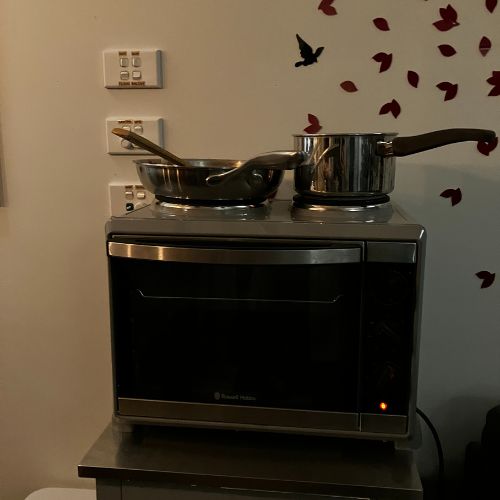 Het koken in ons huisje gaat net even anders dan thuis. We koken namelijk op een elektrisch kookplaatje, dat onderdeel is van een oventje. De bediening van het kookplaatje werkt via de knoppen van de oven. Een bijzonder apparaat. Je kunt dus niet tegelijk iets in de oven en in de pan bakken.